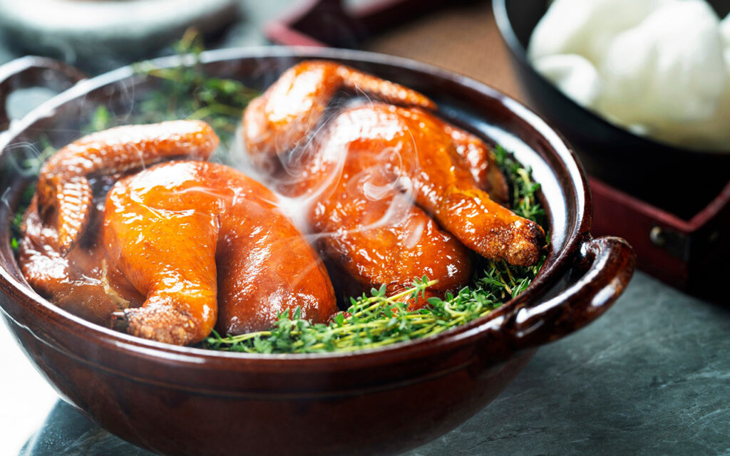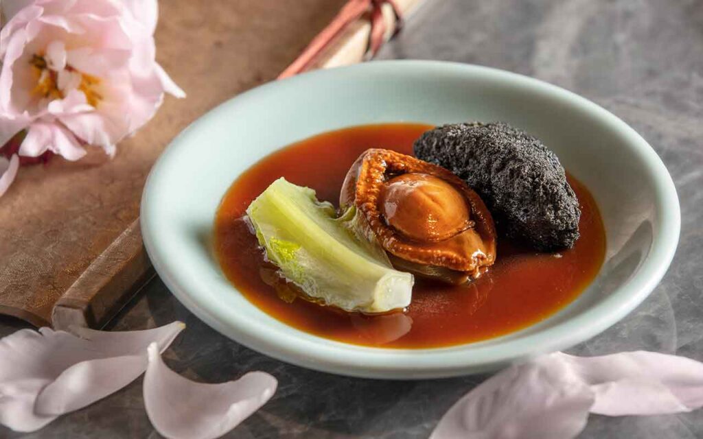 The narrative continues with the likes of Braised Lee Hoong Kee Premium Dried Abalone with Stone Grains, starring sea snails sourced from South Africa and stewed in a house-secret, flavour-rich sauce in an ode to Hong Kong’s love affair with dried seafood and treasured ingredients. Smoked Tin Hong Chicken with Rock Oolong Tea Leaf, meanwhile, showcases the first halal-certified chicken in Hong Kong; the bird is air-dried and smoked with fragrant Fujian tea leaves, resulting in a dish that’s both nostalgic and novel.