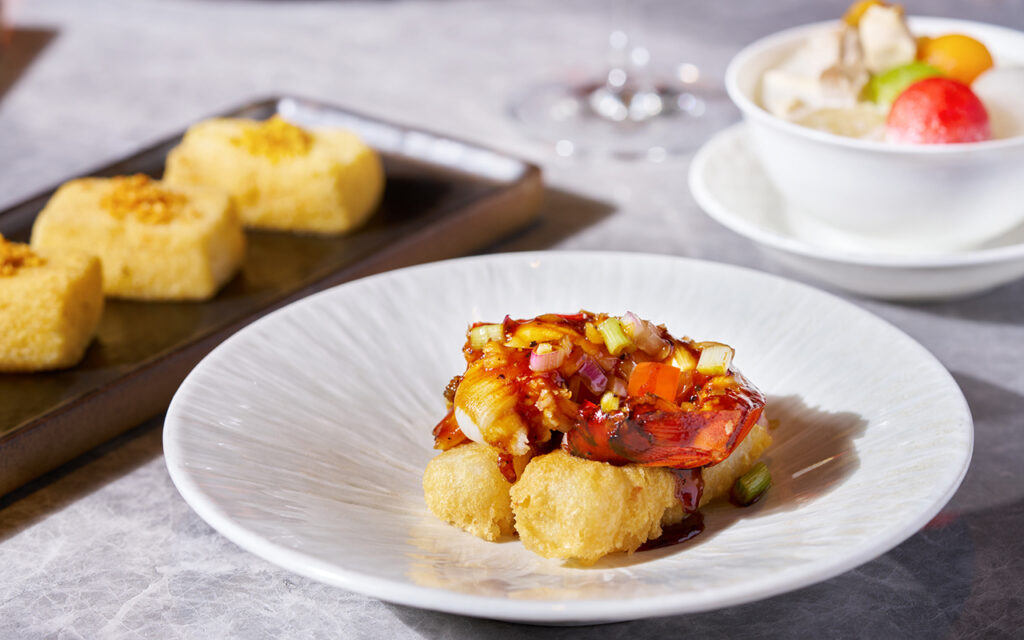 Deep Fried King Crab Claw showcases Hong Kong’s famous Typhoon Shelter cooking method – stir-frying with garlic and chilli to preserve the crustacean’s natural sweetness. The palate-refreshing Homemade Sorbet with Vita Lemon Tea Flavour follows, a homage to the city’s iconic beverage culture.