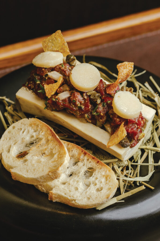 Dinner opens with the beef tartare served in bone marrow topped with a side of baguette toast. This dish is a jazz concert of textures and flavours, where the robust richness of the marrow encounters the delicate nuances of tender raw beef, all while a crispy crostini adds a relay of crunch. Schmitt remarks: “I wanted to modernise classic dishes. This tartare honours French traditions but introduces different textures for a surprising and fresh experience.”