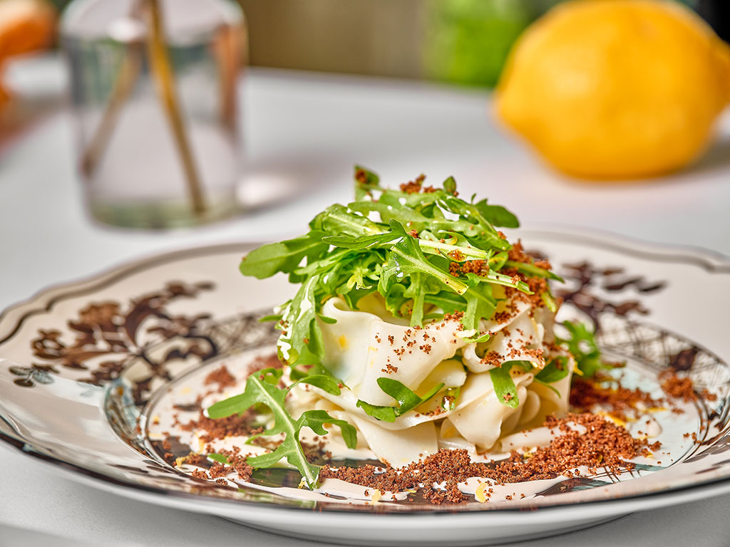 As the year draws to a close, the chef ushers in a culinary journey to the foot of Italy. Grissini’s limited-time seasonal menu highlights the bold flavours of Calabria – the peninsula’s southernmost region – through three dishes starring the fruits of the sea, and an enchanting dessert embracing fruit and chocolate. A delicate melding of freshness and acidity, marinated swordfish carpaccio dressed with bergamot, mandarin oil and sea herbs awakens the palate. For the pasta course, artisanal linguine is tossed with succulent red prawns and nduja, a spicy, spreadable salami that adds a fiery kick.