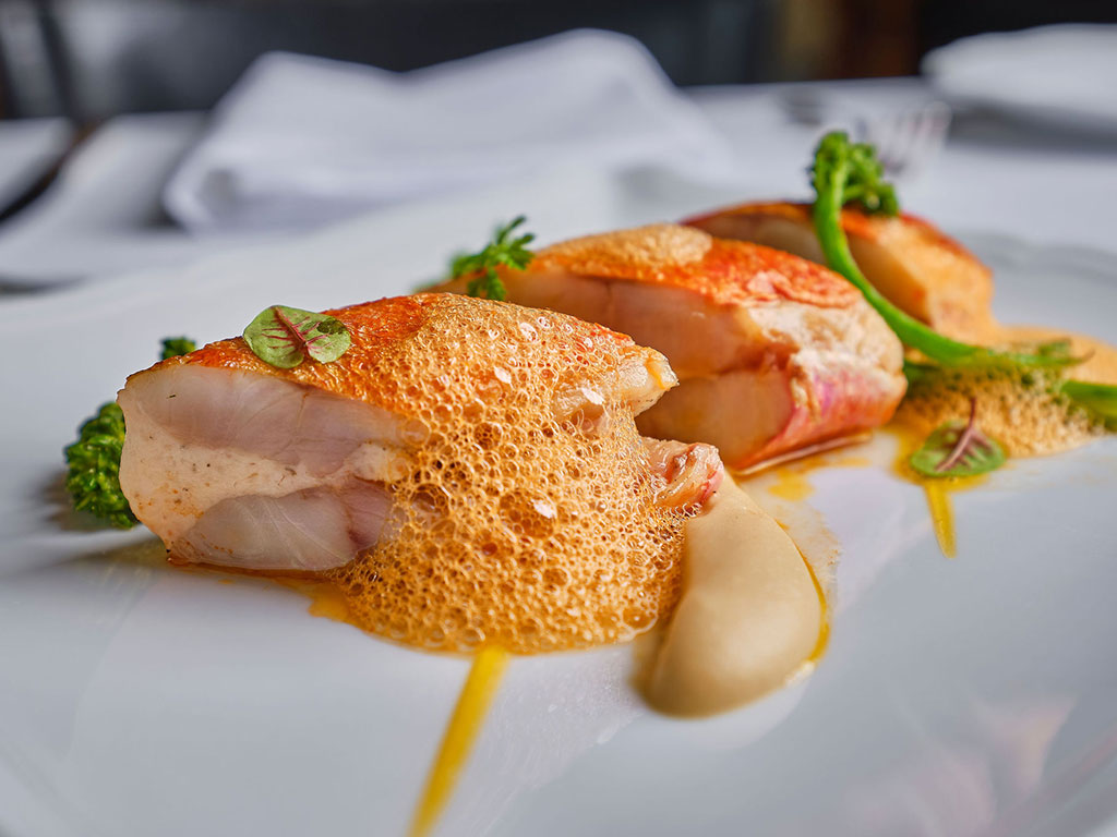 The main of seared red mullet, beautifully paired with a light, delicate prawn mousse, offers a perfect balance of richness and finesse. Kaki (persimmon) espuma, pomegranate jelly, chestnut and dark chocolate sorbet concludes this Calabrian adventure in a sweet explosion of textures and taste.