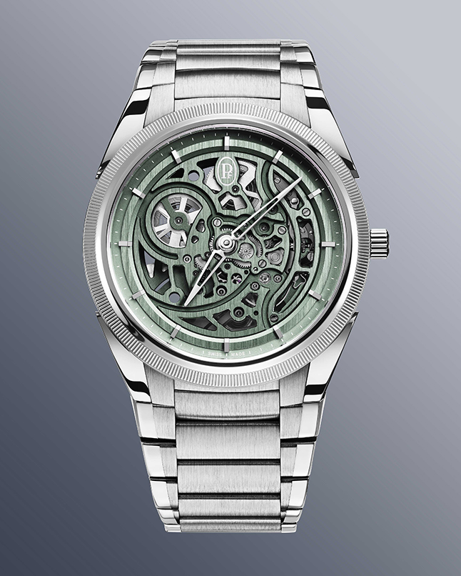 Last month’s Geneva jamboree also saw Parmigiani Fleurier roll out many new additions, including a Slate Green version of the Tonda PF Skeleton. Encased in stainless steel, its luminous slate-green sandblasted and satin-finished openworked dial traps the light, illuminating the intricate calibre PF 777 movement in a magical dance of watchmaking artistry. Meanwhile, the dial of the Tonda PF Chronograph No Date 40mm in Mineral Blue is blessed with a grain d’orge hand-guilloche pattern that underscores its soothing colour palette.