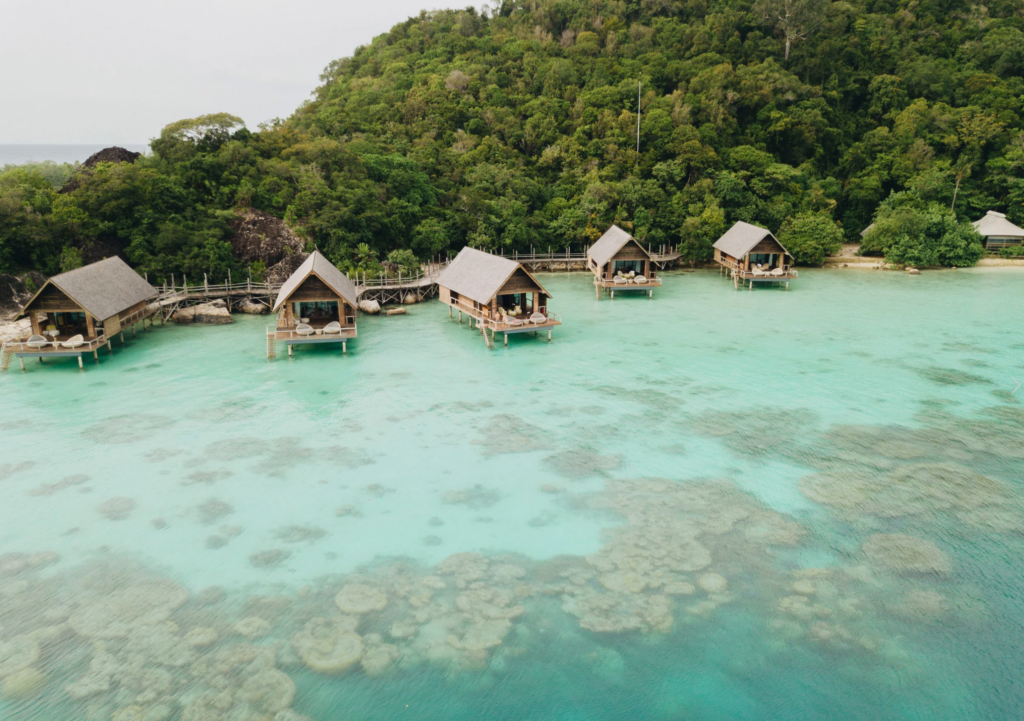 A harmony of nature, hospitality and planet-first philosophy, the resort spans six private isles and a marine conservation area. Guests indulge in an all-inclusive experience – though alcohol is an add-on – with accommodation comprising overwater bungalows, jungle lodges or tented suites, each sustainably constructed with natural materials. Dining is a delight at four restaurants and bars serving farm-to-table fare and freshly caught fish.