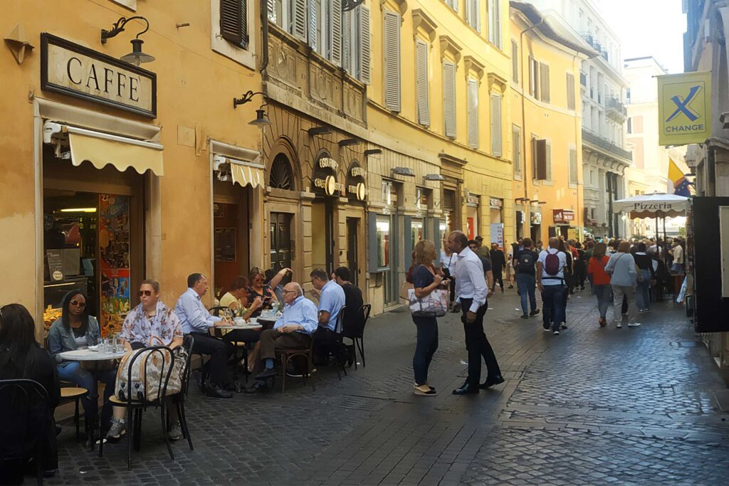 No matter how Rome’s streets twist and turn they always finally open onto a piazza grand or quaint. Usually located near an important building or three, these are inevitably gathering places, with outdoor cafés and restaurants ready to meet your needs, whether for a quick pick-me-up, or a lingering meal for two. Italians typically start their day with a sweet cornetto (pastry) and an espresso that is strong enough to blast your eyes wide open.