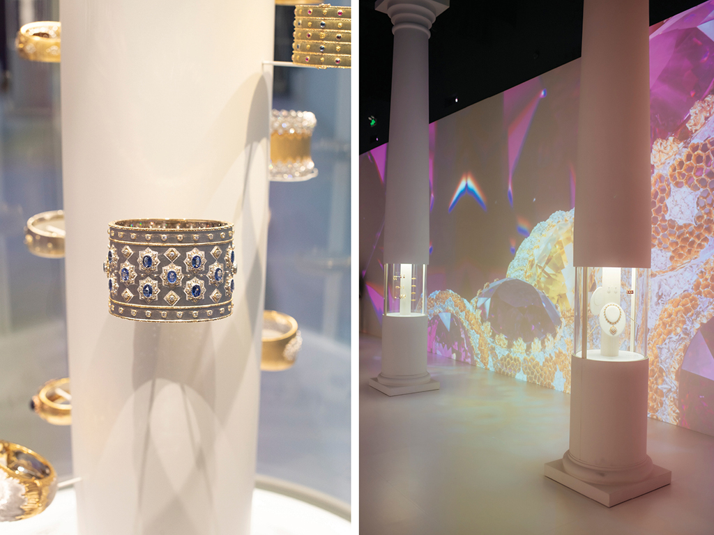 The journey culminates in a metaphysical gallery, an ode to Buccellati’s high jewelry and innovative techniques. Classical white columns frame masterpieces spanning from the 1920s to today, each pairing historical pieces with contemporary marvels. The centrepiece is a tribute to Antonio Canova’s Cupid and Psyche, symbolizing the eternal dialogue between classical ideals and modern sentiment. This space also features rare, loaned treasures from collectors worldwide, offering visitors a chance to witness the full breadth of Buccellati’s enduring influence.