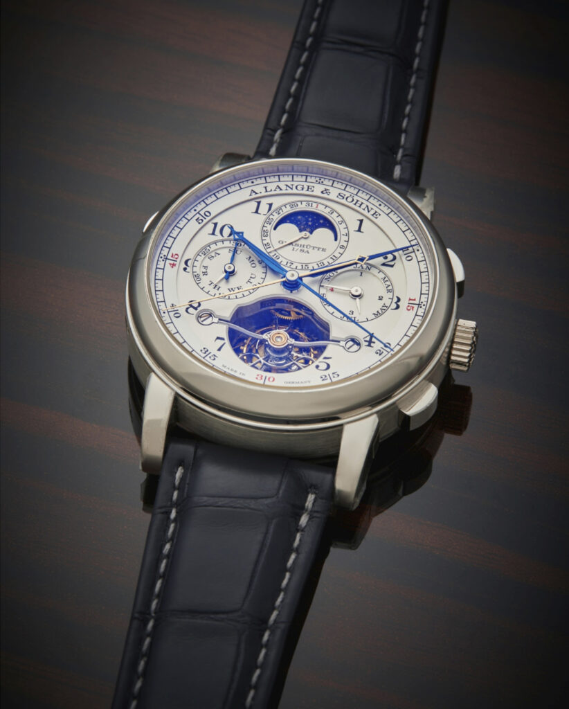 Combining a tourbillon, chronograph and fusée-and-chain transmission, the A. Lange & Söhne Tourbograph Perpetual Pour le Mérite is a technical tour de force. This 2017 limited-edition release reflects Lange’s commitment to precision and artistry. An iteration in platinum was auctioned in Hong Kong in May 2022 for HK$2.9 million (about US$386,000).