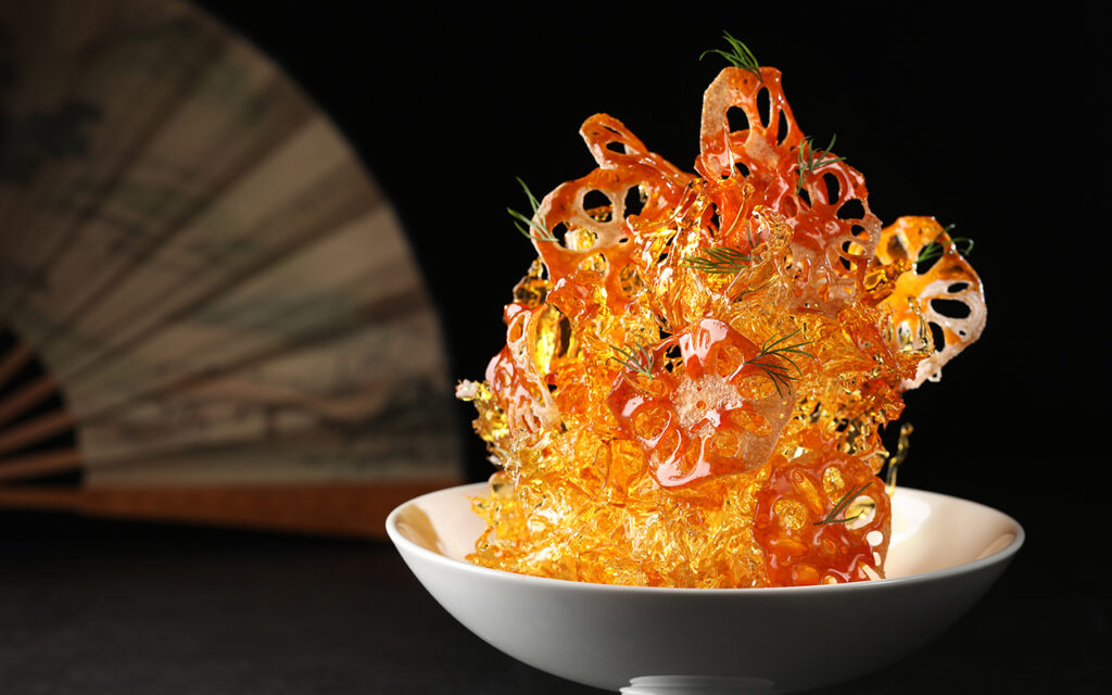 Take, for example, the opening act of Chilled King Prawn with Seaweed and Lee Kum Kee Soy Sauce. Here, Chau reimagines traditional Chiu Chow flavours with a modern twist: succulent prawns are marinated in naturally fermented soy sauce, paired with kudzu rice transformed into delicate ‘caviar’, and infused with Tieguanyin sparkling tea.
