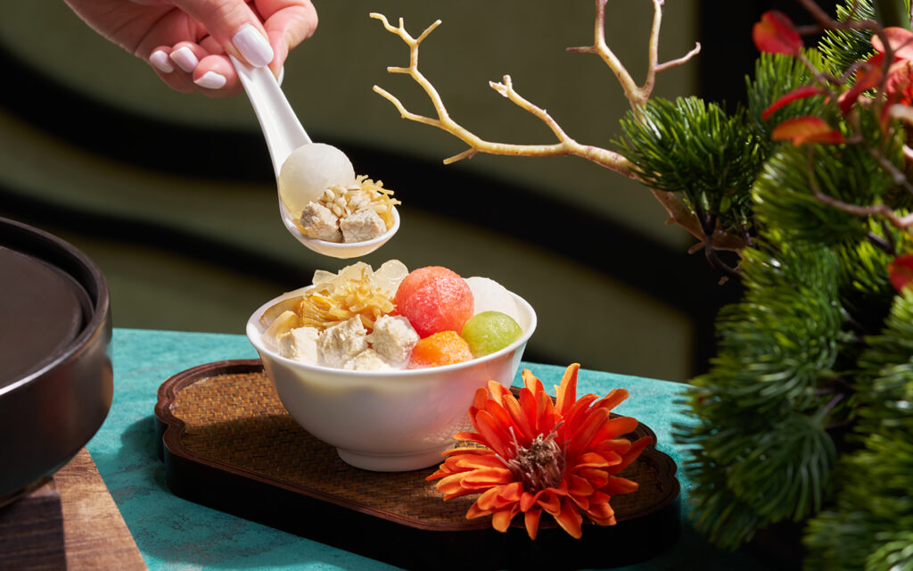 Part of what makes this experience special is the collaboration with local brands that embody Hong Kong’s culinary resilience. Lee Kum Kee sauces lend depth, Tin Hong Chicken instils freshness, and Nestlé’s condensed milk adds a touch of sweetness to the elegant Longan and Gum Tragacanth Panna Cotta, the first of two desserts.