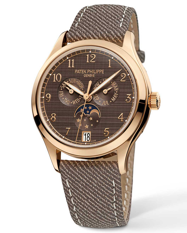 Patek Philippe ushered in a plethora of novelties including a new rose-gold version of its patented Annual Calendar, a wondrous mechanism revealed in 1996 that automatically adjusts the calendar indication for months of 30 or 31 days. Measuring 38mm in diameter, the Annual Calendar Moon Phases Ref. 4946R sees the warm tones of the gold complement a chestnut-coloured dial embossed with a vertical and horizontal satin-brushed finish in the shantung style. Rose-gold applied numerals and leaf-shaped hands with white luminescent coating impart extra finesse to the display. Days and months are indicated by hands, while moon phases and date are discerned through apertures.