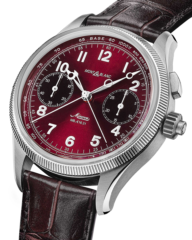 Montblanc’s new 1858 Split Second Chronograph Limited Edition watch takes its inspiration, and its robustness and durability, from a military monopusher from the 1930s. This fetching 100-piece, 44mm stainless-steel model features a dark-burgundy-hued sunray face with black counters. The dial is encircled by a tachymeter scale and a white-gold fluted bezel, while white luminescent Arabic numerals act to enhance legibility. The 1858 The Unveiled Minerva Chronograph in steel enhanced by a yellow-gold bezel is another attractive limited-edition newcomer. It is powered by the Montblanc Manufacture MB M17.26 movement, which has been flipped over and constructed upon pillars to reveal the full glory of its inner workings though the sapphire-crystal dial.
