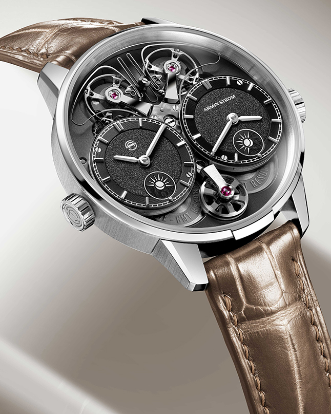 Another watch that seems to merge dial and movement into a single entity is Armin Strom’s Dual Time GMT Resonance Manufacture Black Edition, released precisely in time for Watches and Wonders. Building on last year’s white gold model, its ARF22 movement with clearly visible hand-decorated components has a patented mechanism that ensures greater accuracy through two independent regulating systems connected by a resonance clutch spring. The 39mm steel case highlights the black beauty of the dial and mainplate.