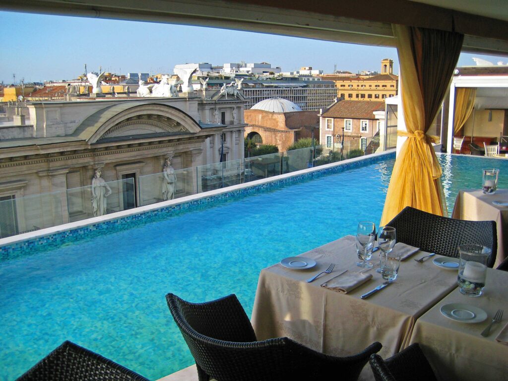 Watching the sun set over the city is also a pleasure not to be missed, and the view from the top of the Spanish Steps in Rome’s glitzy shopping district will take your breath away. Bar hop from there to Sky Blu rooftop at the Aleph hotel, to Seen by Olivier at the Anantara Palazzo Naiadi hotel, and to Roof Garden at the Bio Hotel Raphaël, and the view will leave you completely breathless. Or take a pine-scented stroll from Trastevere up to the Piazzale Giuseppe Garibaldi to enjoy 360-degree views of the city bathed in the glow of day’s last light and build up a good appetite before heading to a rooftop showstopper restaurant such as Gigi Rigolatto Roma at the Orient Express La Minerva hotel.