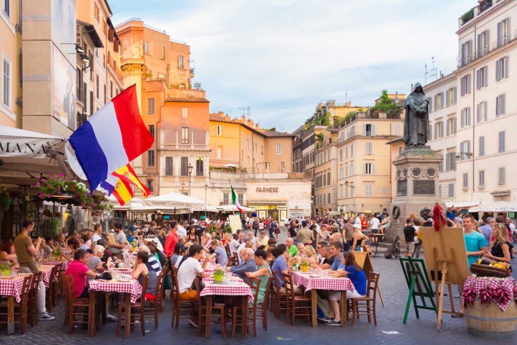 No matter how Rome’s streets twist and turn they always finally open onto a piazza grand or quaint. Usually located near an important building or three, these are inevitably gathering places, with outdoor cafés and restaurants ready to meet your needs, whether for a quick pick-me-up, or a lingering meal for two. Italians typically start their day with a sweet cornetto (pastry) and an espresso that is strong enough to blast your eyes wide open.